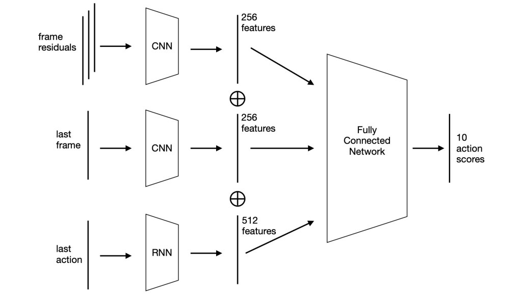 The three preprocessed frame residuals are fed into a 5 layer convolutional neural network (CNN). Each layer in this CNN is followed by a ReLU activation, batch normalization and average pooling. In the end, this yields a total of 32 features maps, each of size 8 x 4. These 32*8*4 = 1024 values are then passed through a final linear layer to give 256 features.